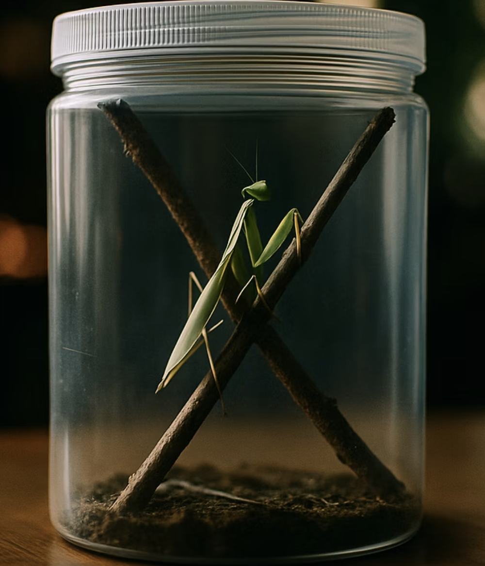 사마귀의 집을 꾸밀 때 가장 중요한 것은 '높이'입니다. 사마귀는 땅을 기어 다니기보다는, 나뭇가지 같은 곳에 매달려 생활하고 허물을 벗는 '탈피' 역시 거꾸로 매달려서 하기 때문입니다. 따라서 옆으로 넓은 통보다는 위로 길쭉한 형태의 투명한 플라스틱 사육통이나 곤충 채집통이 이 친구에게 훨씬 안락한 공간이 되어줍니다. 물론, 신선한 공기가 드나들 수 있는 환기 구멍은 필수입니다.