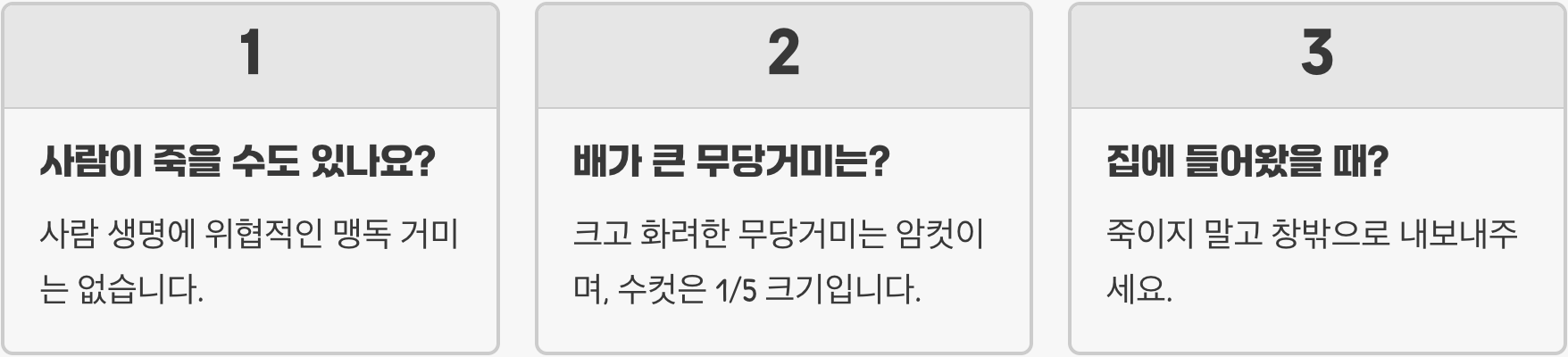 무당거미의 독액은 어디까지나 작은 곤충들을 제압하기 위해 진화된 것입니다. 따라서 우리처럼 덩치가 큰 포유류에게는 그 효과가 거의 미미한 수준입니다. 비유하자면, 개미에게는 치명적인 살충제가 사람에게는 거의 해가 없는 것과 같은 이치죠. 이 사실을 아는 것이 불필요한 공포를 없애는 가장 확실한 해결책입니다.