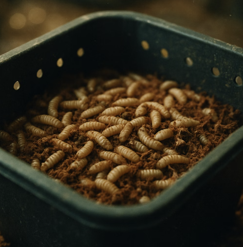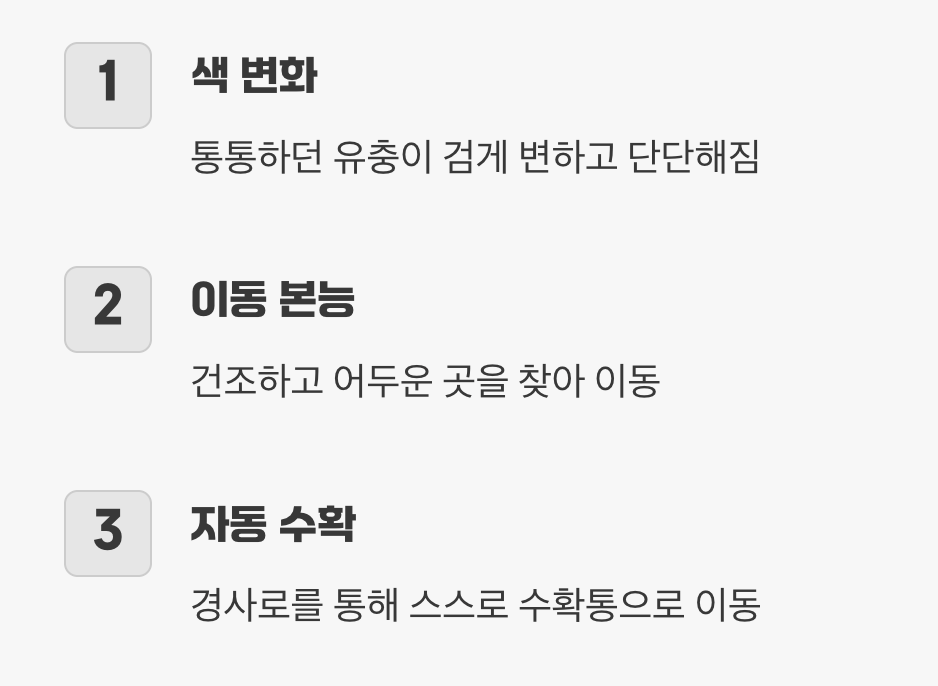 이 본능을 활용하는 것이 바로 '자동 수확 시스템'의 핵심 원리입니다. 사육통 내부에 경사로를 만들어 주면, 번데기가 될 준비를 마친 유충들이 스스로 경사로를 기어올라 미리 준비해 둔 수확 통으로 '알아서' 떨어집니다. 이렇게 수확한 번데기는 낚시 미끼나, 닭이나 물고기의 영양가 높은 특식 사료로 훌륭하게 활용될 수 있습니다.