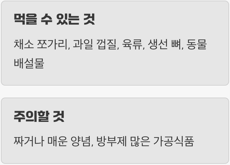 동애등에 유충의 가장 큰 장점은 바로 '가리는 음식이 거의 없다'는 점입니다. 채소 쪼가리, 과일 껍질은 물론, 지렁이가 잘 먹지 못하는 육류나 생선 뼈, 심지어 동물의 배설물까지 거의 모든 유기물을 완벽하게 분해합니다.
