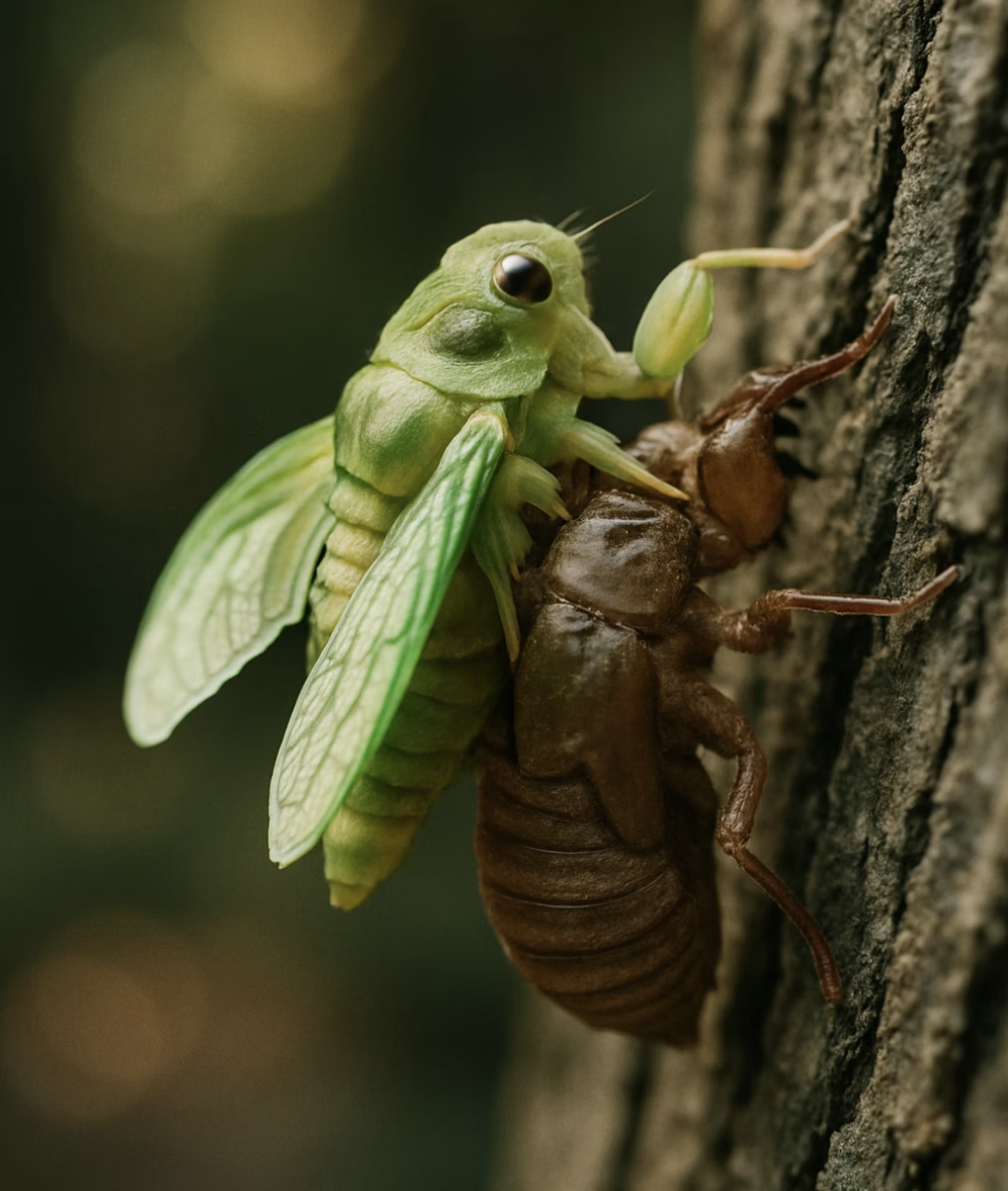 자리를 잡은 약충은 얼마 지나지 않아 몸을 위아래로 흔들며 마지막 변신을 준비합니다. 잠시 후, 등의 일부가 ‘쩍’ 하고 갈라지면서 그 틈으로 연둣빛의 부드러운 매미 성충이 서서히 모습을 드러냅니다. 이 경이로운 탄생의 순간이 바로 ‘우화(羽化)’입니다.